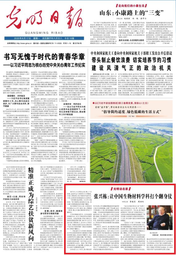 8月17日,光明日报头版以《张兴栋:让中国生物材料学科打个翻身仗》为题,报道了光明日报记者对张兴栋院士的专访内容。全文如下: