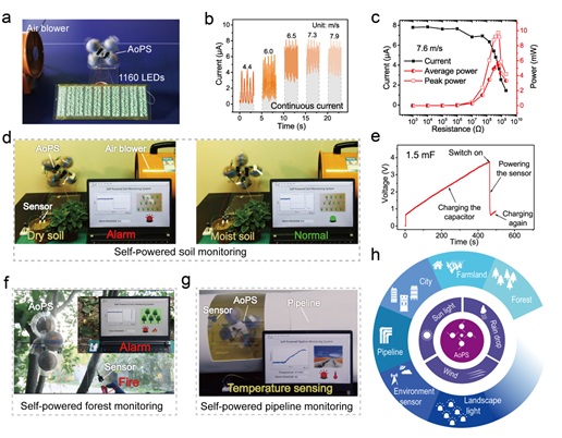 图2 多合一环境电源的性能及应用场景。(a)风力驱动下点亮1160个LED灯。(b)风力驱动下四个球形摩擦纳米发电机的短路电流。(c)7.6m/s风速下器件的输出功率。(d)基于多合一环境电源的自驱动土壤湿度监测系统。(e)自驱动土壤湿度监测过程中储能电容的充放电过程。(f)基于多合一环境电源的森林防火监测系统。(g)基于多合一环境电源的管道温度监测系统。(h)多合一环境电源的应用展望。