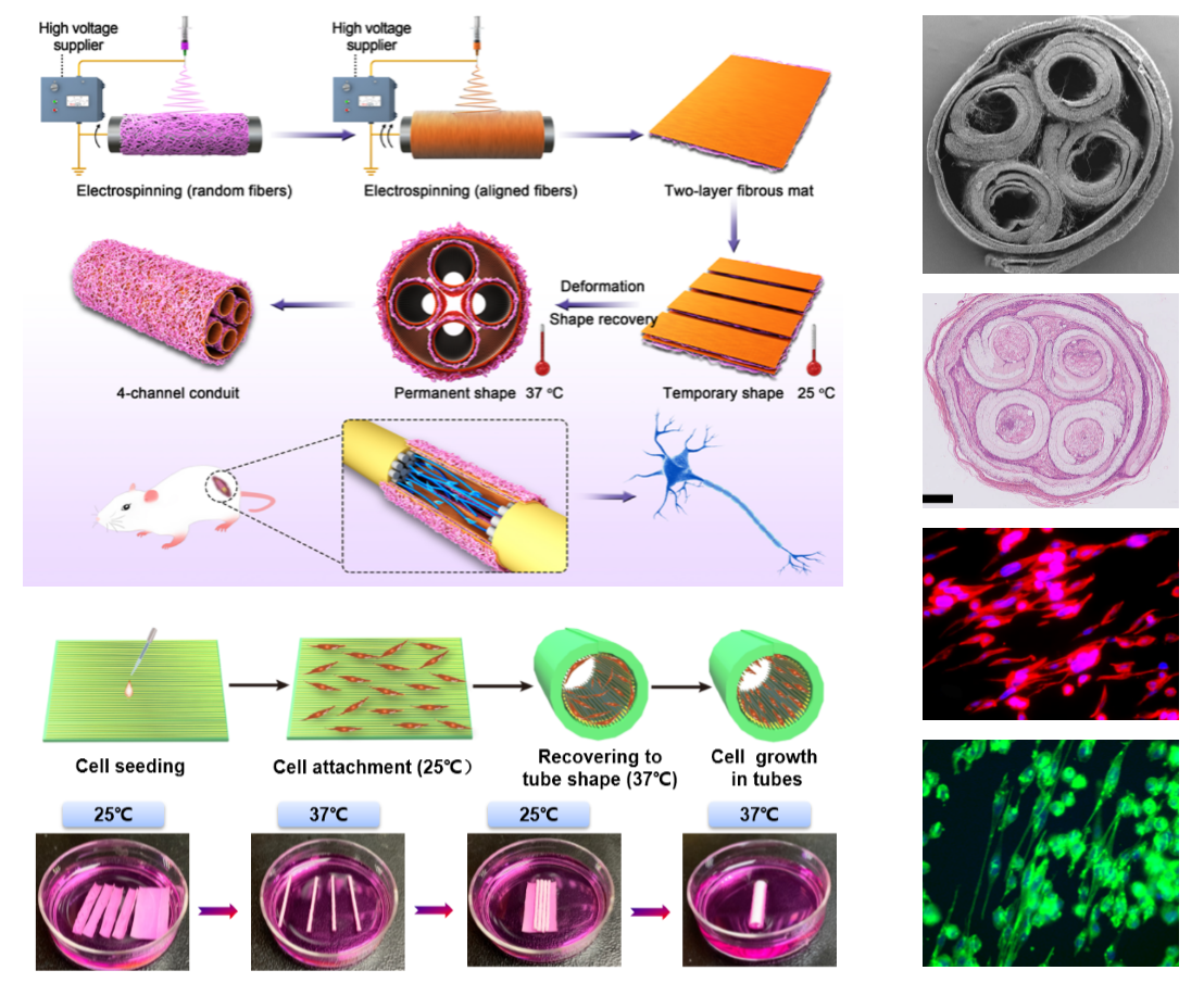 长段神经缺损往往导致靶器官功能受损,致残率较高。仿生天然神经束的多通道神经导管能有效防止轴突分散、减少神经错配,更加有利于神经功能的恢复。研究团队提出将温度响应的形状记忆聚合物引入神经导管的构建,通过静电纺丝技术制备双层纳米纤维膜,利用材料本身的形状记忆特性实现体温下形变响应,快速构建多通道神经导管。同时,导管内壁具有引导神经突触生长的取向纤维结构。该神经导管的构建方法实现了雪旺细胞在导管中的均匀负载和高密度生长,取向的导管内壁结构显著促进了神经突触的延伸。在大鼠坐骨神经缺损模型中,构建的多通道导管有效的促进了缺损神经的再生和功能的恢复。该项工作为神经导管的构建和制备提供了新的策略和方法,也为临床周围神经长段缺损的修复提供了新的治疗选择。