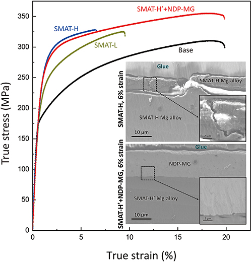 图3.双相金属玻璃+SMAT(NDP-MG coated SMAT-H′)镁合金室温力学性能