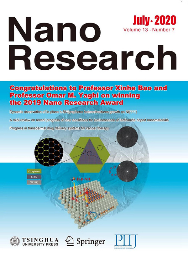 面内二维异质结构能够整合不同二维材料的优点,拓展其在光学、电学器件领域内的应用,然而外延异质结构的可控制备和规模化生产,尤其是微观构建机理仍有待进一步研究。包信和教授和崔义研究员以Ni(111)表面上的化学气相沉积方法直接外延生长六方氮化硼/石墨烯面内异质结构为主线,借助表面原位动态成像技术,系统的研究了六方氮化硼作为成核模板在构建外延异质结构中的作用。研究发现,当六方氮化硼的生长顺序先于石墨烯时,石墨烯倾向于沿着外延六方氮化硼边界生长并形成外延石墨烯,进而拼接成单一取向的外延异质结构。当石墨烯先成核时,由于Ni(111)基底中的近表层碳物种削弱了石墨烯/Ni(111)界面相互作用,导致非外延石墨烯产生。以此为模板继续生长六方氮化硼所构建的异质结构也是非外延的,将难以获得高质量的二维异质结材料。此外,该研究还揭示了六方氮化硼在Ni(111)表面上的生长动力学遵循表面扩散控制机理(Diffusion-limited Aggregation, DLA)而不是边界反应控制机理(Reaction-limited Aggregation)。这一研究加深了对面内二维异质结构的外延特性调控以及二维材料在金属表面生长动力学的理解。此项研究结果以封面文章的形式发表在Nano Research期刊上(Dynamic observation of in-plane h-BN/graphene heterostructures growth on Ni(111). Nano Research (2020):1-6.)