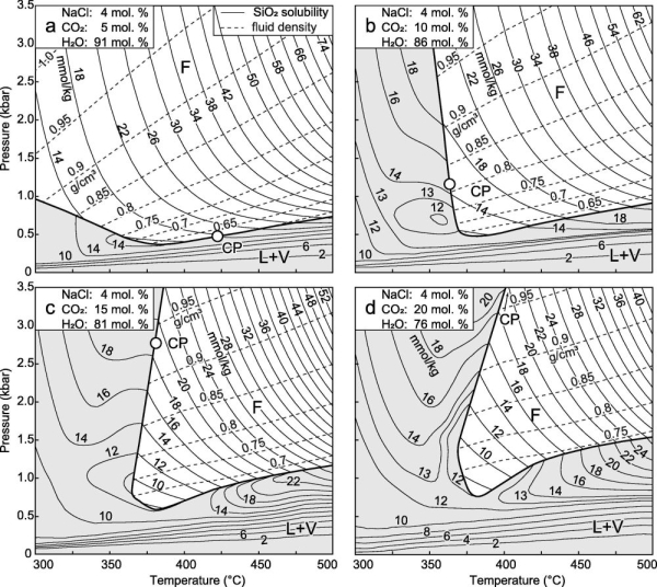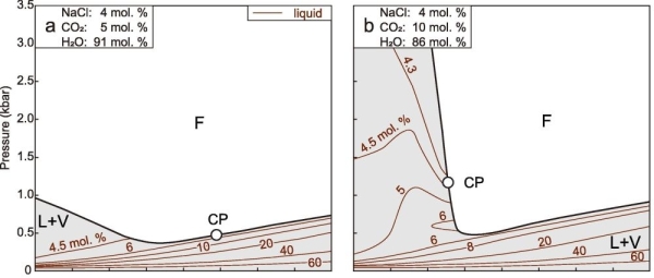 研究发现,减压导致的流体不混溶,产生盐度较高的富液相包裹体和CO2含量较低的富气相包裹体。降温也可导致流体不混溶,会产生多种类型的流体包裹体,盐度和CO2含量较低的富液相包裹体和中-高CO2含量(最高达~65% mol.%)的富气相包裹体。石英溶解度受温度、压力和CO2含量影响,随着降温、降压和CO2含量增加,石英溶解度降低,但在L+V区或相边界局部区域存在着相反的行为(retrograde)。石英溶解度在低温时受压力影响小,在高温时受压力影响大,同理,在低压时受温度影响小,在高压时受温度影响大。石英溶解度模型可解释石英溶解-沉淀行为和不同类型石英脉的形成机制。剪切石英脉(bedding-parallel shear veins)形成过程中,降压导致石英沉淀占主导。拉张石英脉(fault-related extension veins)形成过程中,降压和降温都控制着石英的沉淀。