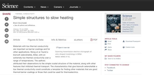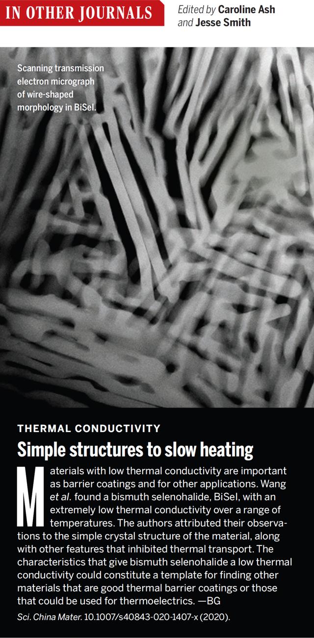日前,由中国科学院和国家自然基金委联合主办的材料领域权威期刊《中国科学:材料》以封面文章的形式发表了北航材料科学与工程学院赵立东教授课题组在低热导材料研究上取得的新进展:《Extremely Low Thermal Conductivity from Bismuth Selenohalides with 1D Soft Crystal Structure》(SCIENCE CHINA Materials, 63 (2020) 1759-1768),并被《科学》杂志以摘选图片的形式进行了亮点报道 (Science, 368 (2020) 1325) (图 1)。