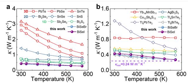 该课题组近期的研究兴趣主要集中在:在宽带隙半导体中,通过降低晶体结构的维度筛选低热导率材料,进而利用输运性质的各向异性解决导电和导热的矛盾,开发新型热电材料。研究对比发现IV-VI族化合物中三维立方结构的PbTe、PbSe和SnTe具有较高的热导率。随着晶体结构从三维降低到二维和一维,层间和链间的散射作用抑制了声子传输,从而降低了热导率。对于一维链状结构的BiSeX, Bi和卤素离子X1-的弱成键作用进一步降低了热导率,形成了一维的“软”链状,即在晶体的三个轴向的化学键均为弱结合,表现出近似零维的晶体结构特征。该特殊的结构使BiSeI的热导率接近于理论最小值,达到了~ 0.27 Wm-1 K-1,显著低于众多具有低热传导特征的块体材料(图3)。