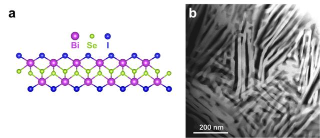 图2.(a)BiSeI的一维链状晶体结构,(b)STEM下BiSeI材料中的纳米线结构