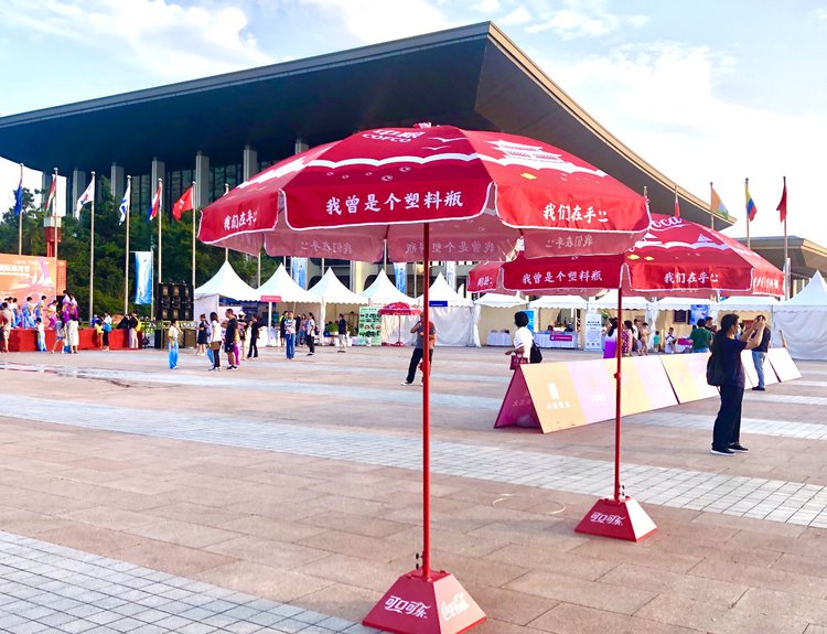 在活动现场,除了这些环保太阳伞,还有可口可乐不“瓶”凡展区,展示采用塑料瓶回收再造的包包、衣服等环保产品周 边。