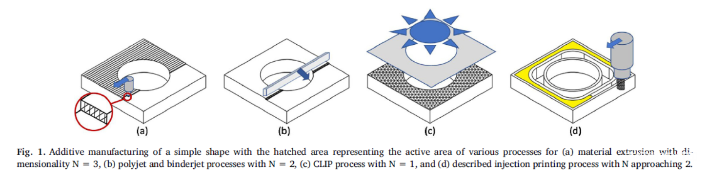 △(a)FFF技术 (b)粘结剂喷射技术 (c)Carbon的DLS技术 (d)本文介绍的注射打印技术
