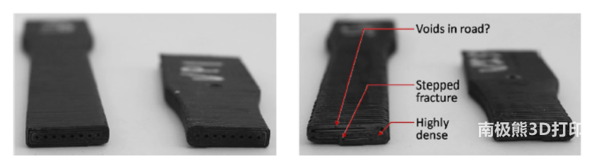△传统FFF材料挤出工艺(左)和注塑打印工艺(右)制作的垂直拉伸试样的失效面