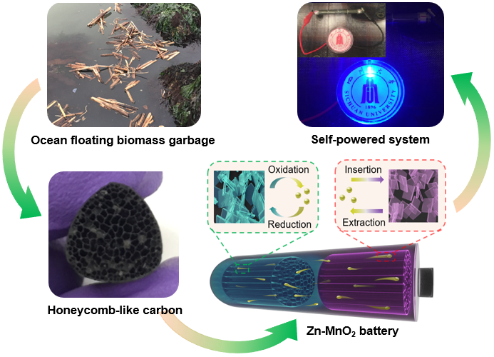 图1. 利用海洋漂浮垃圾制备锌锰电池及自供电系统示意图
