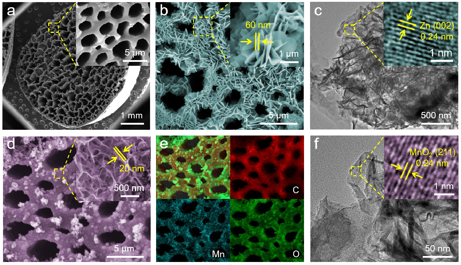 研究对象海洋漂浮垃圾(OG)具有类似“蜂窝状”的规整孔洞结构,高温碳化后这一结构被很好保留。碳化后生物质垃圾(COG)的大孔孔洞尺寸主要分布在100~500 μm之间(图2a),大孔周围还分布有大量的微小孔洞,尺寸主要分布在1~5 μm之间。电沉积的Zn纳米片(平均厚度约为60 nm)和水热沉积的MnO2(平均厚度约为20 nm)纳米片均匀分布在通道的表面和内部。