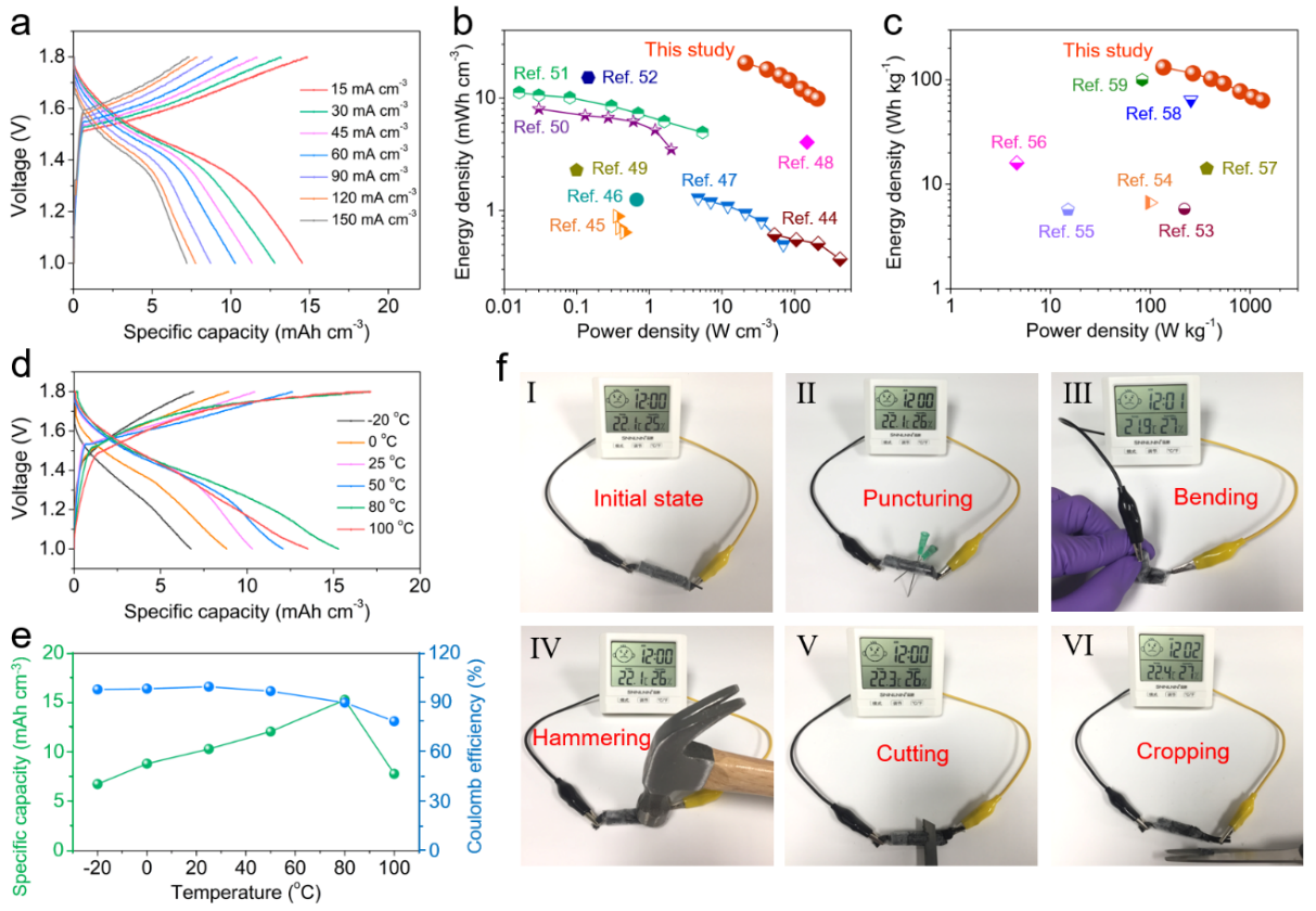 采用PVA/LiCl-ZnCl2-MnSO4凝胶作为电解质组装的COG@MnO2//COG@Zn准固态电池,能量密度高达20.5 mWh/cm3或420.1 Wh/kg,而且可以在非常宽的温度范围(-20~100℃)内安全工作,甚至受到一系列人为破坏(如穿刺、弯曲、锤击、切割和剪切)后,电池依然可以正常工作,表现出非常优秀的安全性能。