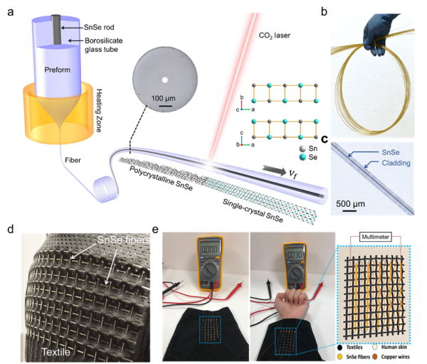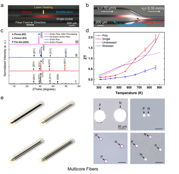 图1.基于纤维热拉法和激光重结晶效应的柔性单晶SnSe热电纤维制造技术