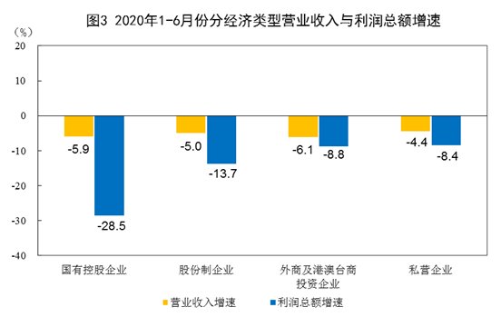 1—6月份,规模以上工业企业中,国有控股企业实现利润总额6614.1亿元,同比下降28.5%;股份制企业实现利润总额18247.1亿元,下降13.7%;外商及港澳台商投资企业实现利润总额6486.4亿元,下降8.8%;私营企业实现利润总额7119.8亿元,下降8.4%。