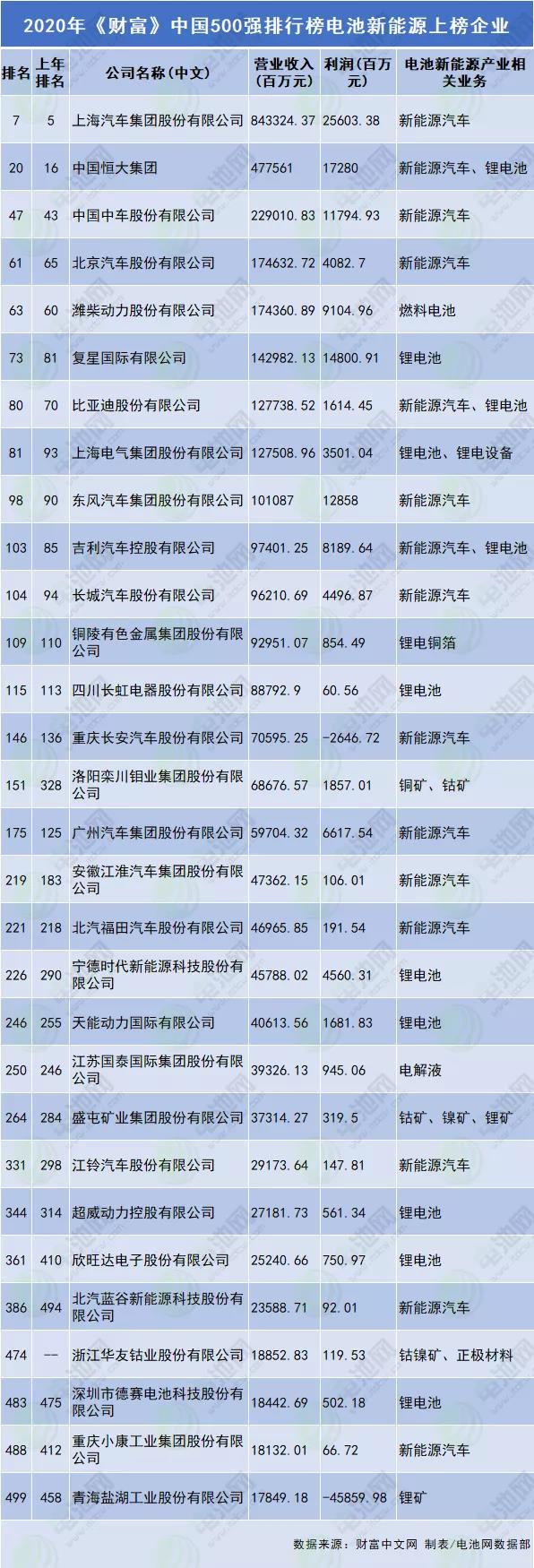 今年,电池新能源产业有30家企业上榜《财富》中国500强排行榜,统计在内的30家企业总营业收入超3.4万亿元,利润总计842.5亿元。其中,19家企业排名较2019年上升,浙江华友钴业股份有限公司为新上榜的企业,排名第474。
