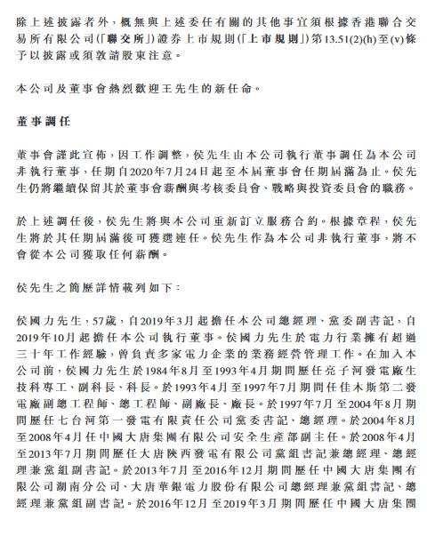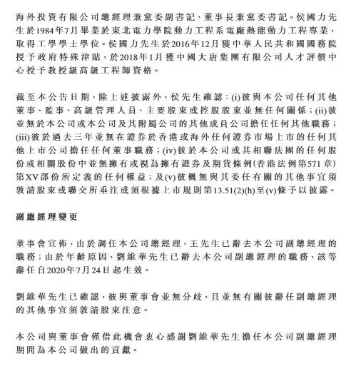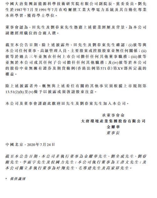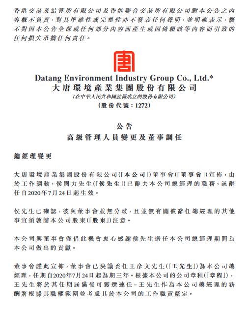 大唐环境发布公告,于工作调动,侯国力已辞去公司总经理的职务,该辞任自2020年7月24日起生效。