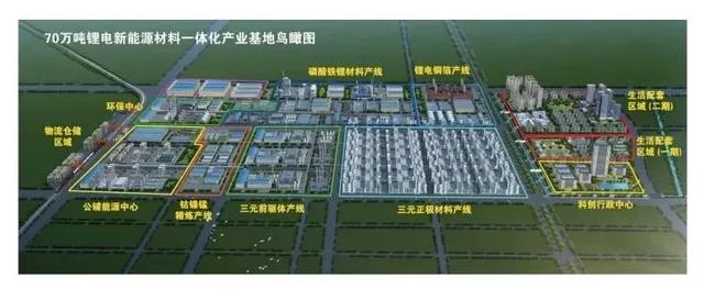 70万吨锂电新能源材料一体化产业基地项目总投资约1300亿,规划年产70万吨三元正极材料、50万吨磷酸铁锂、10万吨铜箔、3万吨钴酸锂。产业园区规划三大核心区,分别为7000亩精炼化工区、6000亩锂电材料生产区、2000亩办公及生活配套区,分三期建设。其中,一期建设年产15万吨锂电三元正极材料,5万吨磷酸铁锂联动10万吨磷酸铁以及配套公辅、基础设施,总投资300亿元(其中产线投资175亿元),2020年7月开工建设,2022年7月建成投产。