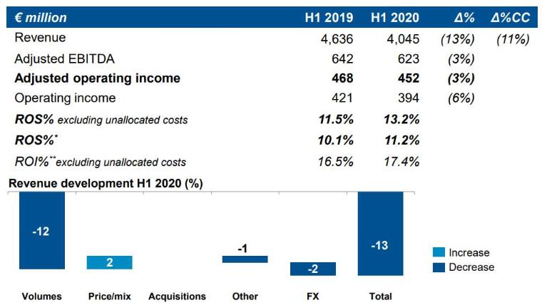 半年报显示,来自持续经营业务的调整后每股收益为1.51欧元,同比增长8%。截至2020年6月30日,净债务为16.83亿欧元(2019年:6200万欧元),主要是由于股票回购计划和已支付的股息。此外,截止2020年第二季度末,集团拥有员工33200人,同比减少了1300人。