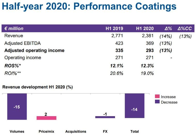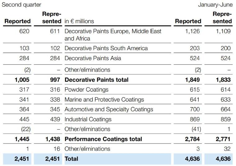 粉末涂料业务第二季度的销售收入下降了26%,以固定货币计算则下降了25%。由于新冠肺炎疫情的影响(尤其是对汽车行业的影响)以及分销渠道和建筑活动的封锁(尤其是在本季度初),价格/混合价格持平,销量较低。