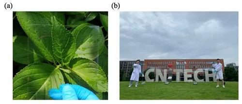 图2 (a) 实验室制备的100mm×100mm小样和 (b) 幅宽600mm的柔性透明电磁防护材料中试样品