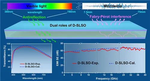 图1 可实现可见光550纳米波长透过率接近90%和10-40GHz频段电磁屏蔽效能达到60dB的透明电磁防护材料