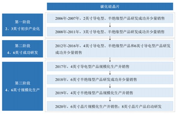 天科合达自2006年成立以来,一直专注于碳化硅晶体生长和晶片生产领域,先后研制出2英寸、3英寸、4英寸碳化硅衬底,于2014年在国内首次研制出6英寸碳化硅晶片,并已形成规模化生产能力,工艺技术水平处于国内领先地位。
