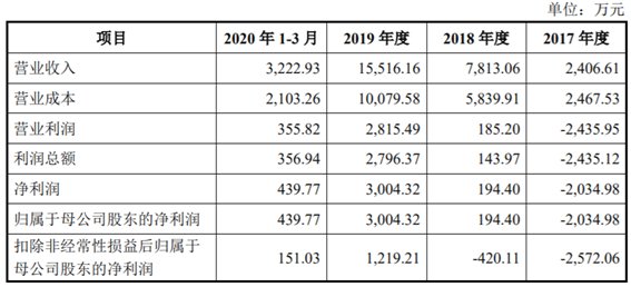 招股书披露,2017年至2019年,天科合达分别实现营业收入2,406.61万元、7,813.06万元和15,516.16万元,归属于母公司所有者的净利润分别为-2,034.98万元、194.40万元、3,004.32万元,扣除非经常性损益后归属于母公司所有者的净利润分别为-2,572.06万元、-420.11万元、1,219.21万元。