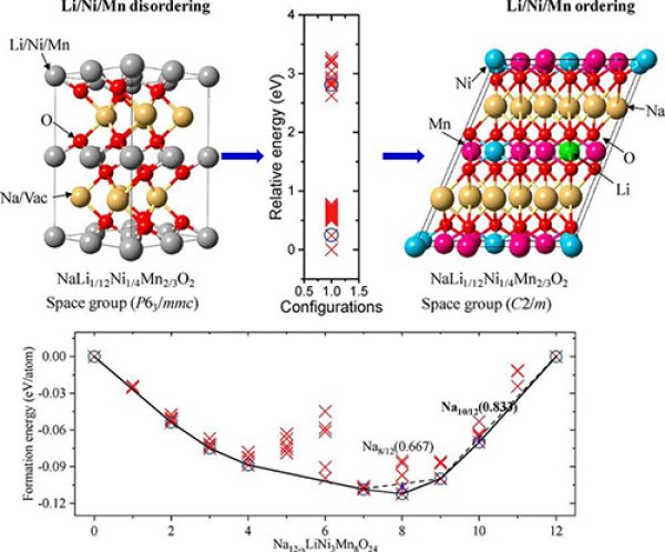 图3.(a) Na12-xLiNi3Mn8O24中Li/Ni/Mn的排列;(b) Na12-xLiNi3Mn8O24-LiNi3Mn8O24中的相稳定性