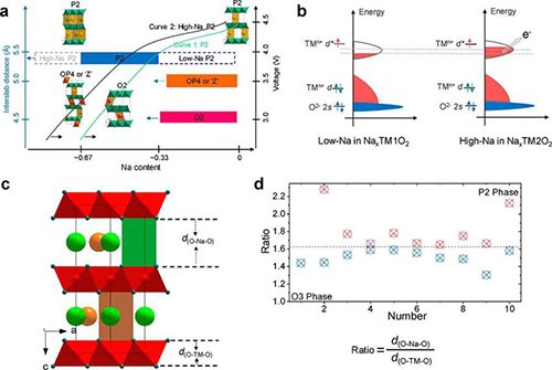 图1.(a) 高钠含量P2氧化物在脱钠过程中的结构演变机理;(b) 低/高钠含量P2氧化物的电子结构;(c) P2氧化物晶体结构;(d) dO-Na-O和dO-TM-O在P2和O3型化合物中的比值