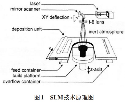 在金属增材制造中,SLM是应用最普遍的技术之一,由Fraunhofer研究所于1995年在德国提出,利用激光选区熔化打印金属材料,图1为其技术原理图。SLM技术的激光器能量密度很高,能够直接用激光熔化粉体,不需要粘结剂,具有很高的成形性能。经过SLM技术制备的零件具备相当高的致密度,力学性能优异,非常适合实际工程应用。