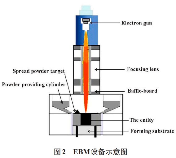 EBM技术,其技术原理为: 采用电子束焊接工艺在真空环境中,熔化金属粉末材料,然后按照设定的路径逐层堆积而成形出金属制件。通过EBM技术可以成形结构复杂、成分纯度高的金属零件,但是其成形尺寸受到了粉体环境与车床的限制。设备示意图见图2。