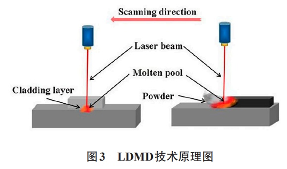 LDMD技术也称为激光堆焊技术,早在二十世纪六十年代就被提出,通过使用高能激光在两个金属材料表层之间形成熔覆层,然后经快速固化得到性能良好的涂覆层。但是受到工艺与残余应力等影响,熔覆层常常存在缺陷,在成形精度、成本等方面仍有不足。技术原理图见图3。