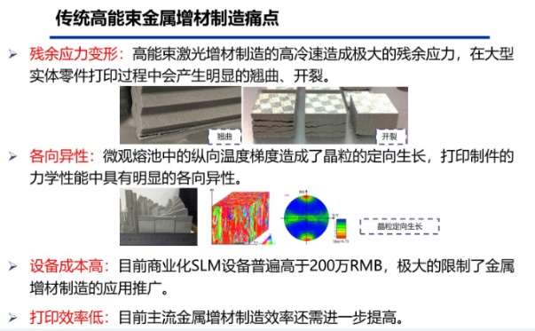 由于中国市场对金属材料 3D 打印的接受度仍处于初期阶段,3D 打印技术在中国生产制造行业的渗透率的确还远不如美国、德国等国家。传统高能束金属增材制造痛点如下图: