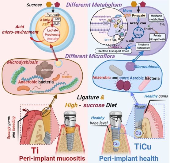 研究结果表明,与登腾种植体相比,Ti-Cu种植体能维持其周围厌氧菌和需氧菌之间的菌群平衡,促进口腔正常有氧呼吸代谢微环境,避免微环境趋于厌氧与酸化,抑制厌氧产酸菌繁殖,进而抑制种植体周围炎的发生(图1)。这一结果打破了“抗菌材料在动物体内杀死细菌”的传统观念。相关研究成果于6月16日在线发表在Bioactive Materials杂志上。金属所2019级博士生刘徽为第一作者,中国人民解放军北部战区总医院口腔科汤雨龙副主任医师为共同第一作者,金属所任玲项目研究员、香港中文大学秦岭教授、金属所杨柯研究员为通讯作者。