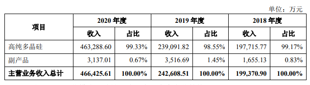 2020年度,大全能源高纯多晶硅及副产品的收入分别为46.33亿元、0.31亿元;占比分别为99.33%、0.67%。