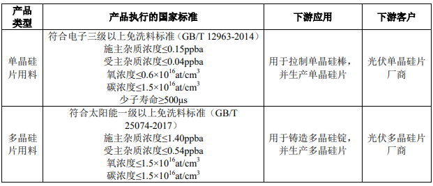 招股说明书显示,大全能源生产的高纯多晶硅,主要用于光伏硅片的生产,硅片应用于下游光伏电池、光伏电池组件、光伏发电系统等太阳能光伏产品的生产。公司主要产品的具体情况如下所示: