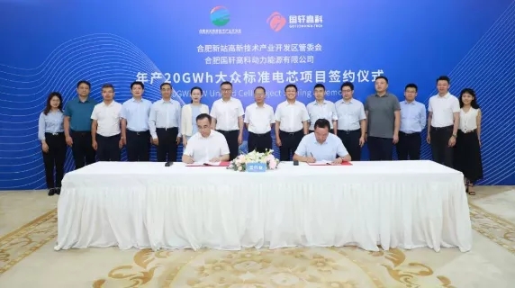 7 月 20 日上午,国轩高科旗下全资子公司合肥国轩高科动力能源有限公司(简称合肥国轩)与合肥新站高新技术产业开发区管委会正式签署合作协议,拟在新站高新区建设 20GWh动力电池生产基地,该基地将专注大众汽车标准电芯的生产制造,这也就意味着大众汽车全球首款标准电芯有望“合肥造”。合肥新站高新区党工委书记、管委会主任王连贵,党工委副书记、管委会副主任蓝天,国轩高科党委书记、董事长李缜,国轩控股集团总裁胡晓明等领导出席并见证此次签约。