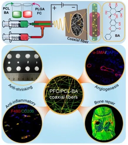 有鉴于此,本研究致力于制备具有类似细胞外基质结构的骨移植替代物,这种多功能载药核壳结构纤维支架可以积极调节免疫微环境并促进血管化骨再生。本研究提出一种简单、有效、可行的策略有效解决了PLGA基纤维支架易收缩的问题;该核壳结构纤维支架巧妙地结合了PLGA和PCL的优点并弥补了各自的缺点;该核壳结构纤维负载了中药成分(黄芩苷),能够调节纤维支架植入体内引起的炎性反应,破骨细胞分化进而实现血管化骨组织再生。