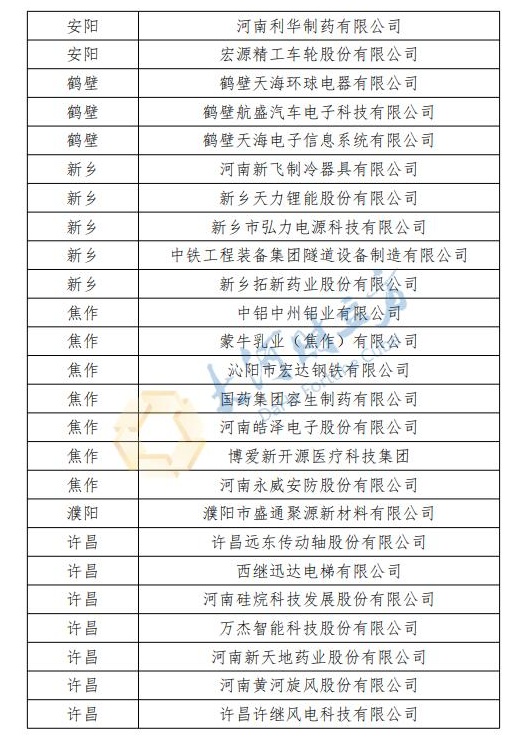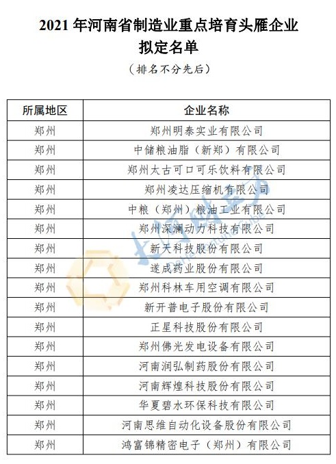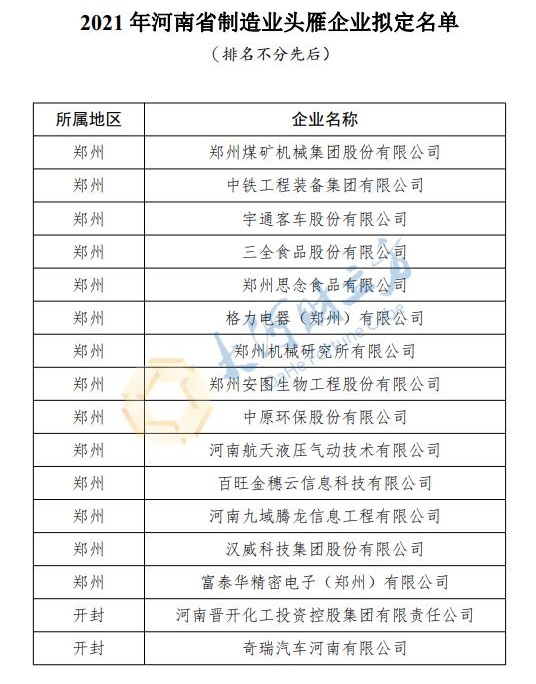 【颗粒在线讯】7月27日,河南省工信厅公示80家河南省2021年制造业头雁企业,89家河南省2021年制造业重点培育头雁企业。