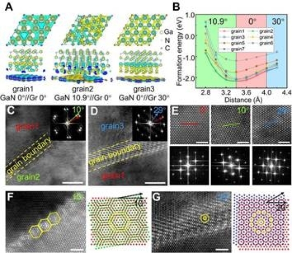 图3.石墨烯玻璃晶圆上氮化物薄膜的面内取向研究。A.石墨烯上氮化物三种不同面内取向配置的原子模型;B.石墨烯上氮化物不同面内取向的形成能;C-D.GaN薄膜10°及29°晶界;E.GaN薄膜每个晶粒内部高分辨TEM图;F-G.GaN薄膜晶界处的摩尔纹
