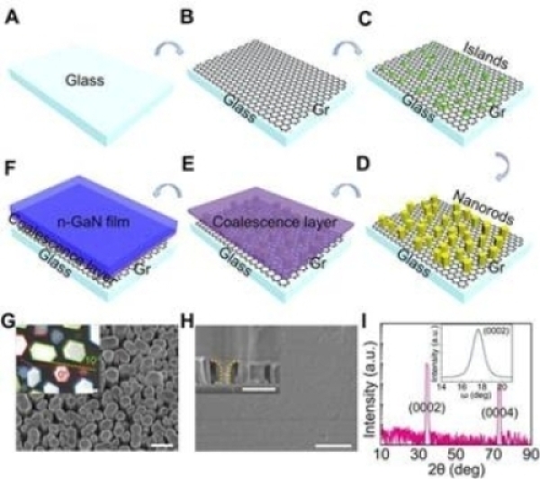 图2.石墨烯玻璃晶圆上氮化物薄膜的生长。A-F.生长过程示意图;G.纳米柱SEM图;H.GaN薄膜SEM图;I.GaN薄膜XRD表征