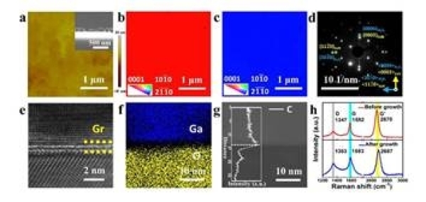 图4.石墨烯-纳米柱辅助的GaN薄膜材料及界面表征。a.AFM及截面SEM;b.面外EBSD;c.面内EBSD;d.界面的SAED;e.界面的HRTEM;f.界面的EDS;g.界面的HAADF STEM;h.生长前后石墨烯Raman对比