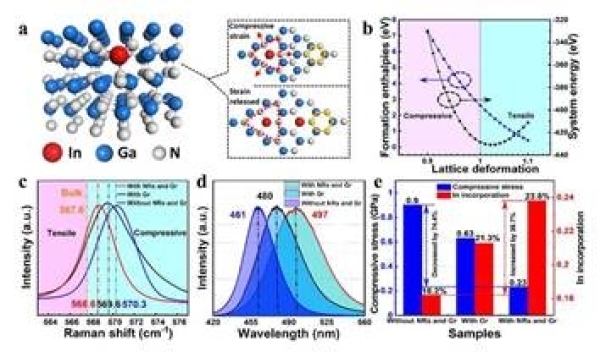 图5.石墨烯纳米柱辅助的InGaN薄膜,In并入理论机制及应力调控结果。a.In原子并入过程原子结构模型图;b.不同应力状态下In并入的DFT计算;c.GaN薄膜应力对比;d.InGaN薄膜的PL对比;e.应力调控及In组分提升结果
