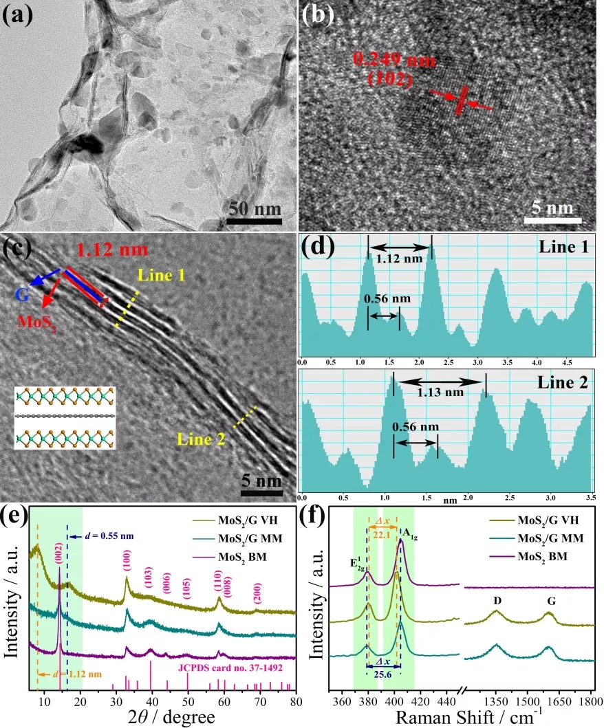 低倍TEM图显示MoS2纳米片的尺寸大小为6-20 nm。HRTEM图显示MoS2和石墨烯呈现出层层堆叠的模式,两层MoS2层间距为1.12 nm。通过对图c中的晶格条纹进行剖面图解析可以看出,高低交错的明暗条纹分别对应与MoS2和石墨烯,距离为0.56 nm,从而证明这种相互堆叠的异质结结构被成功合成。XRD谱图MoS2层间距被扩大到1.12 nm。Raman谱图证明E12g and A1g振动模式之间峰距离Δx为21.6 cm−1,接近于单层MoS2的Δx (20.2−21.2),从而证明该材料趋于少层结构。