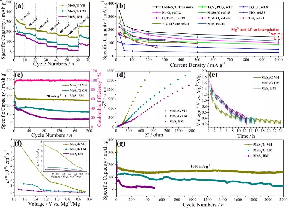 为了证明MoS2/G VH可以实现镁锂双嵌,也测试了该材料的镁电性能、循环后的XPS测试以及ICP-OES测试。该材料的镁离子电池具有较高的容量证明镁可以嵌入脱出该正极材料。此外,通过10次放电和11次充电的XPS谱图中Li 1s和Mg 2p峰强弱变化,证明不管是20 mA g−1还是1000 mA g−1,都是有Li+和Mg2+嵌入脱出正极材料。ICP-OES直接测试了充放电后Li和Mg相对于Mo的含量,经过5次放电后Li和Mg分别为0.74和0.54,证明Li和Mg的同时嵌入。经过6次充电后,Li和Mg仅剩0.09和0.13,从而证明这两种离子的确可以从正极材料中脱出。MoS2/G VH在高电流密度1000 mA g−1仍然可以实现镁锂双嵌。