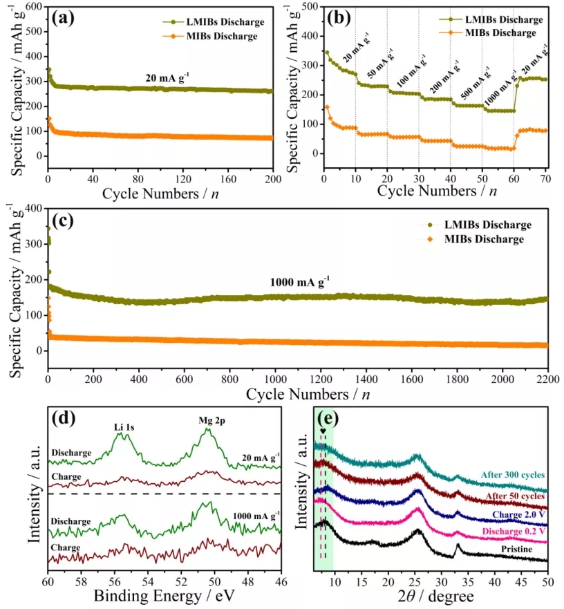 3)该材料即使在高电流密度1000 mA g-1下,仍然可以实现了镁锂的共嵌入。