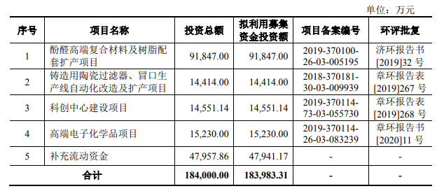 招股说明书显示,圣泉集团是以合成树脂及复合材料、生物质化工材料及相关产品的研发、生产、销售为主营业务的高新技术企业。此次IPO,圣泉集团拟将18.40亿元募集资金用于酚醛高端复合材料及树脂配套扩产,铸造陶瓷过滤器、冒口生产线自动化改造及扩产项目,科创中心建设项目,高端电子化学品项目及补充流动资金。
