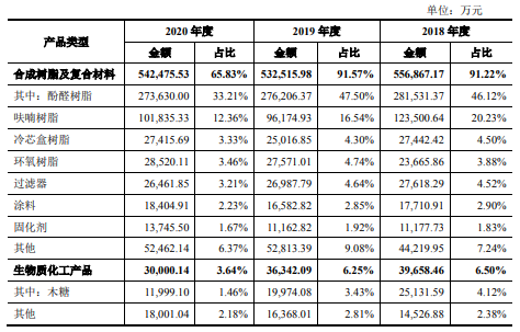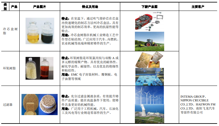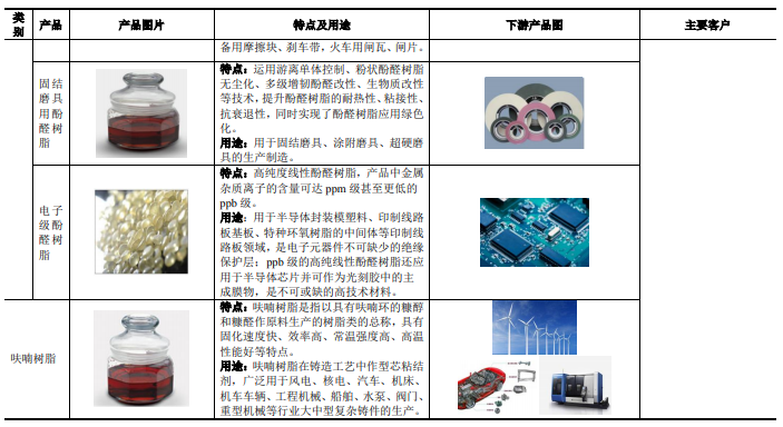 招股说明书显示,圣泉集团主要产品为合成树脂及复合材料、生物质化工产品和卫生防护用品等。公司主要产品基本情况如下: