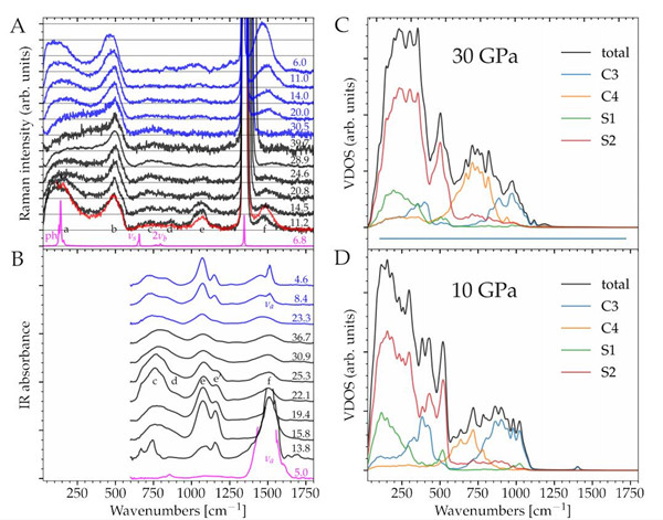 图1. A、B分别是加压卸压过程中测的得拉曼(A)和红外(B)光谱;C、D分别是样品在30 GPa(C)和10 GPa (D)的VDOS理论模拟结果。