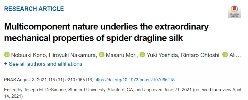 为了通过定量蛋白质组学确定蜘蛛牵引丝的蛋白质成分,对于正确全面地识别与检测到的肽片段相对应的蛋白质而言,高质量的参考基因组和全长编码序列注释至关重要。日本庆应大学KazuharuArakawa教授课题组采用多组学方法定量鉴定了四种大木林蛛属蜘蛛(络新妇科(Nephilinae)亚科)的蜘蛛牵引丝蛋白成分和基因组:女郎蜘蛛、金丝蜘蛛、红腿金球织蜘蛛和大木林蜘蛛。然后,除了蜘蛛蛋白之外,作者还发现了几种共同的低分子量蛋白质。有趣的是,蜘蛛牵引丝的低分子量蛋白质成分使人造丝基材料的拉伸强度增加了一倍。这一发现将极大地推动基于蛋白质的材料的使用和研究。具体的研究结果以题为“Multicomponent nature underlies the extraordinary mechanical properties of spider dragline silk”发表在顶刊《PNAS》上。