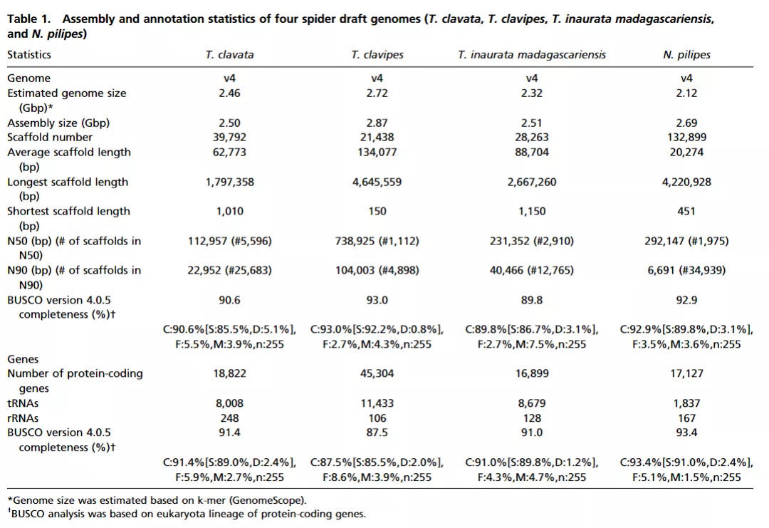 因为蜘蛛基因组庞大而复杂,从头测序具有挑战性。作者从成年的母蜘蛛个体的解剖腿和头胸部组织中提取基因组DNA,并使用短读长和长读长序列技术进行杂交测序。为了获得功能基因集,作者删除了表达水平小于0.1的基因和未注释的基因,最后,分别获得了18822、45304、16899和17127个功能蛋白编码基因组,分别用于女郎蜘蛛、金丝蜘蛛、红腿金球织蜘蛛和大木林蜘蛛(如表1所示)。